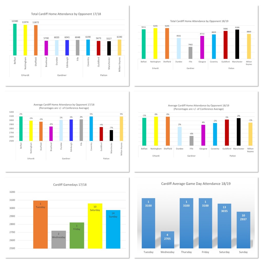Last year I mused on the heavy actual gate bias for in-conference games at Coventry while the averages told a completely different story and this past season it seems that it reinforces the conclusion I came to, it’s a significant bias towards Ehrhardt Conference opposition despite being placed in a conference with Manchester, MK and Guildford. I would imagine Nottingham and Sheffield have the benefit of proximity and despite Cardiff having a fierce rivalry with Belfast this season in the race for the top spot, the Devils still apparently were able to draw the crowds to the Skydome.