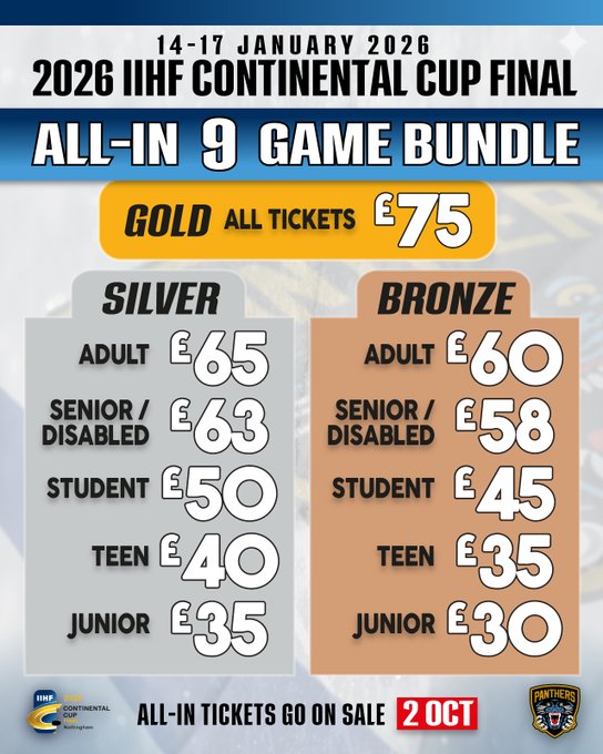 Maybe a debate for another time but what these prices have shown is that perhaps the play-off finals weekend and maybe even game night tickets for hockey in the UK are over-priced. There were a lot of comments from Panthers fans along the lines of ‘shows the play-offs are a rip-off’ and some even questioning the prices of league games at the Motorpoint Arena. While I think there is a valid point there, I do feel that these ticket prices for the Continental Cup have been set deliberately lower to attract a full building and maybe even fans from around the country.