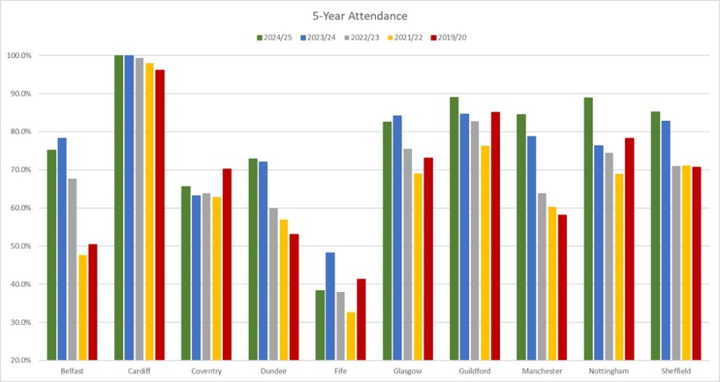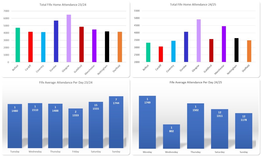 Pretty much all figures are down except, curiously, games against Manchester which overtook the rivalry games against Dundee and particularly for the Scottish teams, when the rivalry games are down, that means trouble. After all the progress of its predecessor, last season was pretty much a step right back to the 22/23 season which, in my article from that year, I actually talked about how there’d been an improvement but it was still probably unsustainable so it was going to take some serious effort from Fife to pull of another u-turn.