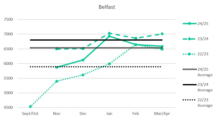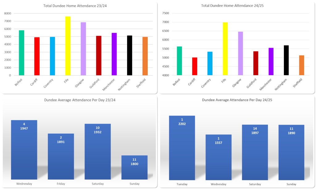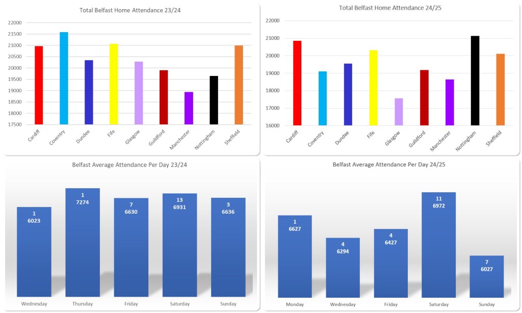For the opposition figures, the Belfast and Cardiff figures are comparable from the previous season and although there was a reduction in the Clan and Flames figures, curiously, games against Dundee and Fife appear to have picked up the slack.
