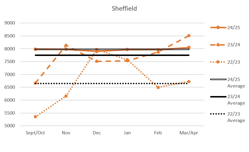 I really wasn’t expecting a drop from figures in Belfast, as a percentage it seems small but it equates to over 250 people per game, on average. Although they didn’t achieve total domination this season (sorry, not sorry!), it was still a good run but perhaps Cardiff’s strong start was enough to put a few fans off who sit on the fringes. The Devils sat atop the Elite League until the Giants deposed them and I’m not saying that this is absolute proof but it does curiously coincide with a surge of attendance at the SSE in January. However, as you can see above, there was an uptake in January of the previous two seasons so it may just be a trend for that particular month.