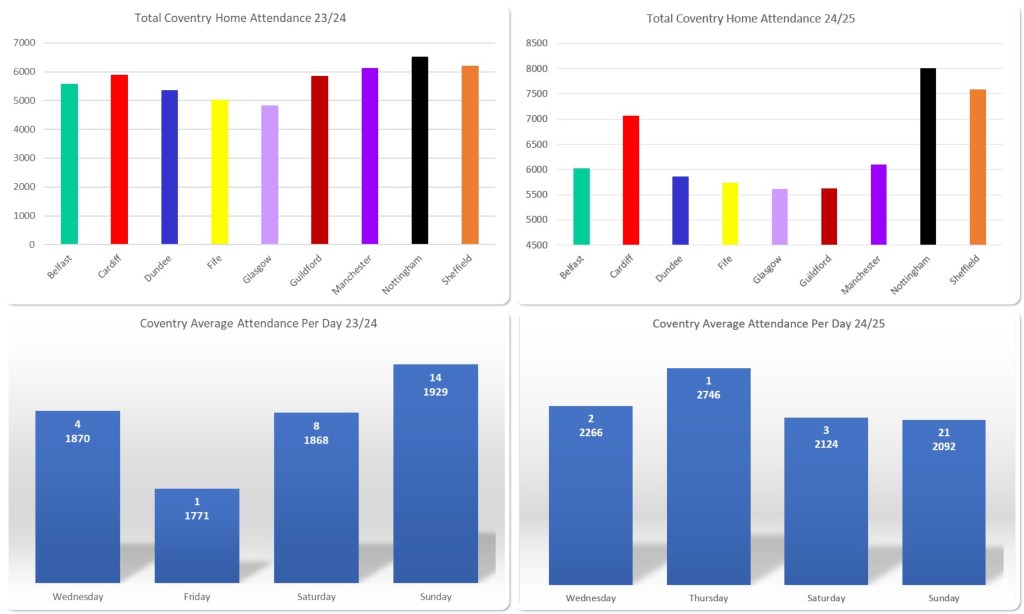 Despite the differing baselines in the opposition charts from last season to the previous, it’s pretty clear that there are some spikes whereas the previous season was a shade more balanced. Another way to look at it is that the attendance against the Storm is pretty much the same so it’s clear that major contributors to Coventry’s upsurge are not particularly surprising. As previously referenced, Cardiff sat atop the league for a large part of the season, Panthers and Steelers were riding the wave of their respective team’s performances so all of these fanbases had a reason to travel in numbers.