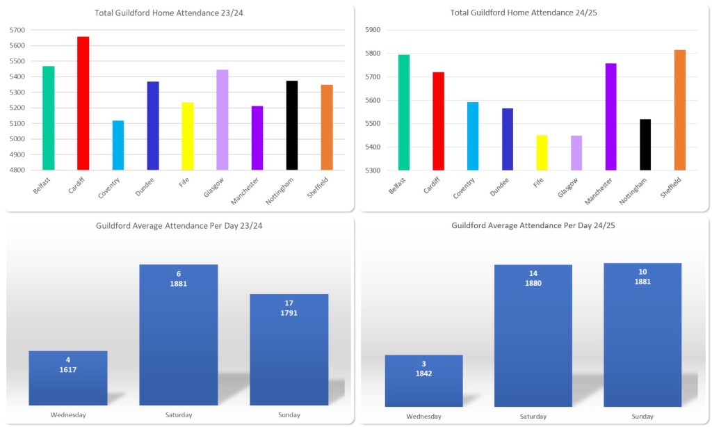 Aside from the season that Guildford were a hair’s breadth from winning the league, they haven’t really made sense to me in terms of their attendance. The good news is that they’re significantly up in general, but I don’t know why. They had a decent season but I’m not sure it warranted that kind of upsurge, don’t get me wrong, I don’t think this is a bad thing, I’m just struggling to rationalise how it happened, whatever it was, it’s a good thing for the Flames and a good thing for the league so well played folks.