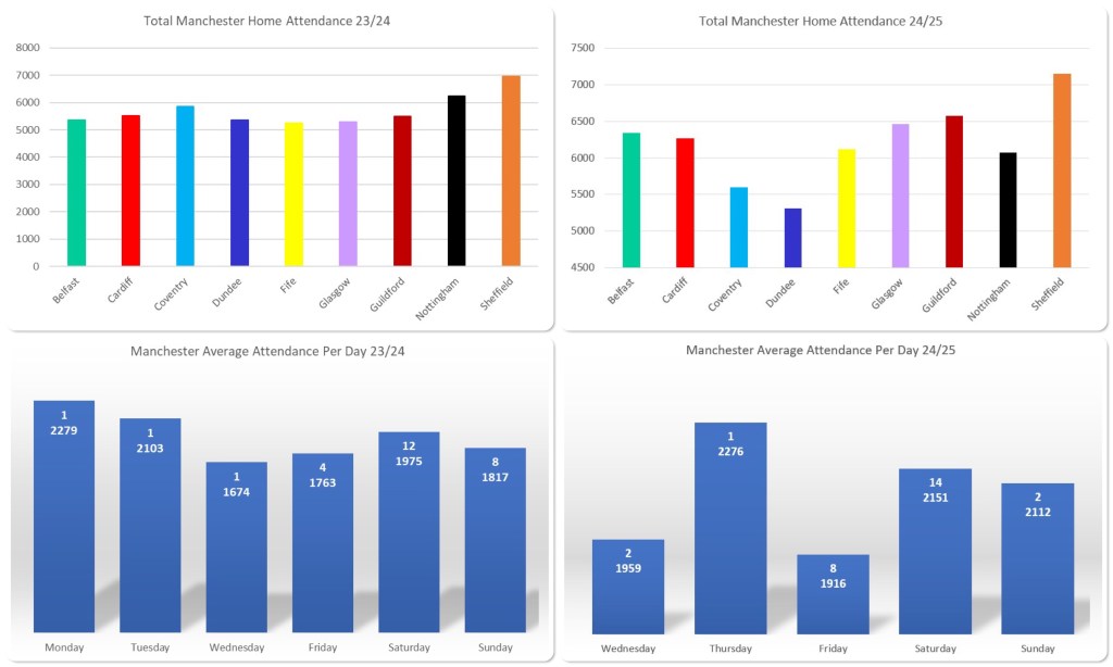 The Manchester Storm organisation have done really well this past season. The season performance doesn’t warrant the attendances they got at all but here we are with an increase on the season before where they did have a decent performance so far play here, they’ve found a way to build on that despite the results not being comparable.
