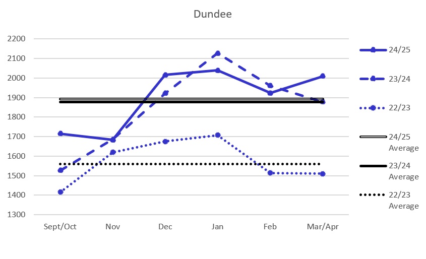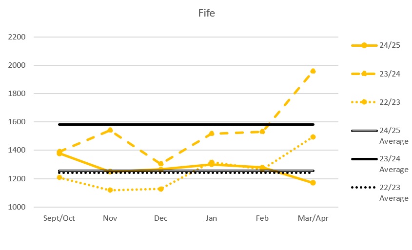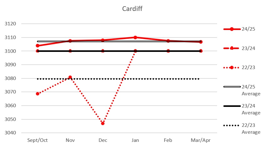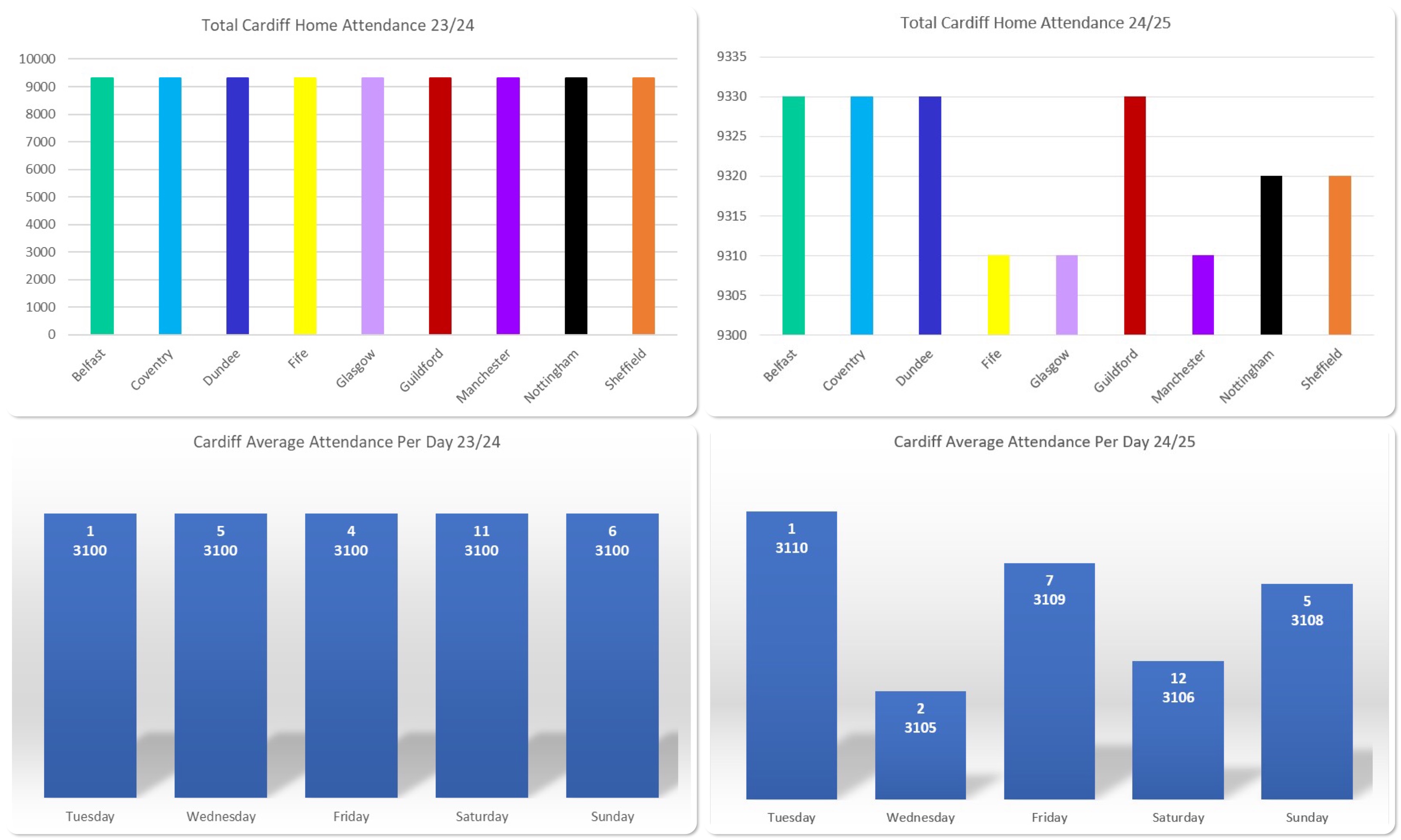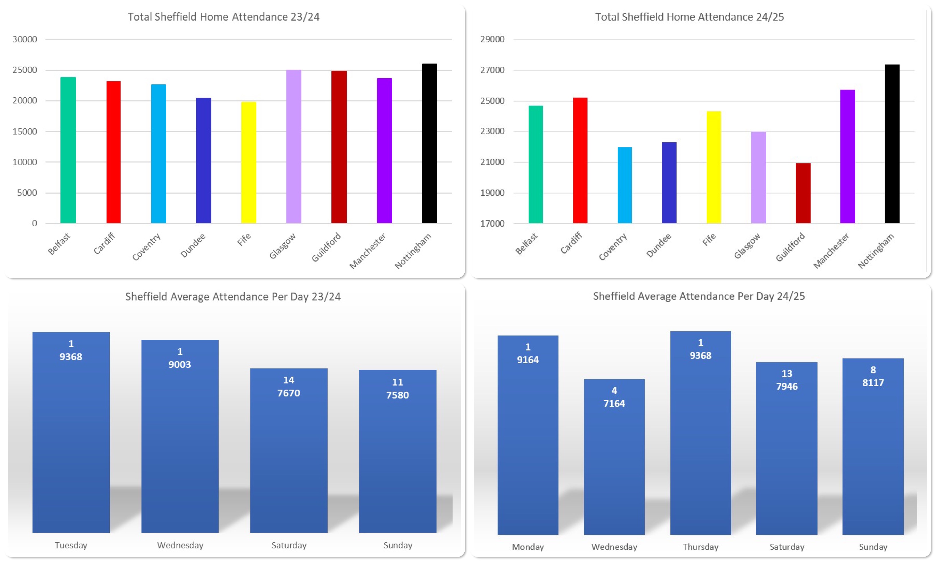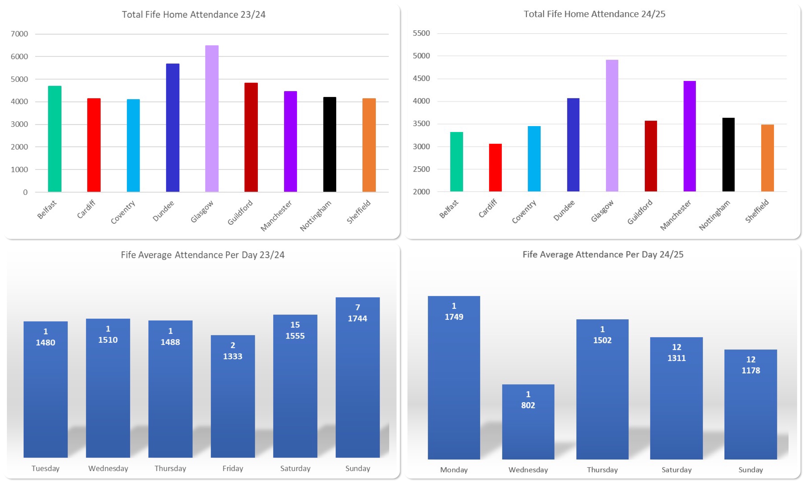 For the opposition figures, the Belfast and Cardiff figures are comparable from the previous season and although there was a reduction in the Clan and Flames figures, curiously, games against Dundee and Fife appear to have picked up the slack.