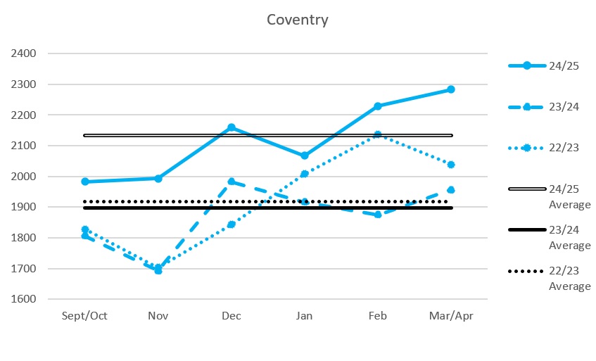 Despite the differing baselines in the opposition charts from last season to the previous, it’s pretty clear that there are some spikes whereas the previous season was a shade more balanced. Another way to look at it is that the attendance against the Storm is pretty much the same so it’s clear that major contributors to Coventry’s upsurge are not particularly surprising. As previously referenced, Cardiff sat atop the league for a large part of the season, Panthers and Steelers were riding the wave of their respective team’s performances so all of these fanbases had a reason to travel in numbers.