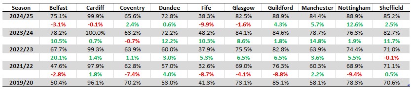The overall story of the Elite League is still a positive one, of the four teams who had reductions, there are fair explanations for most of them. Fife are about to enter a whole new phase of their existence, Cardiff can easily fix their miniscule dip by deciding what their capacity attendance actually is and if the Clan fans can demonstrate some patience and give Corey Neilson the time he needs to build a team that will actually challenge, and trust me Clan fans we know it can happen, then they might see something of a turnaround too. Belfast may see an improvement now the AI algorithm has been fixed and a few more teams have double headers this coming season, I personally can’t stand home doubles but I suppose they’ve had to get used to it due to the nature of other team’s travelling arrangements, the double headers certainly make a difference to the away support and their willingness to travel.