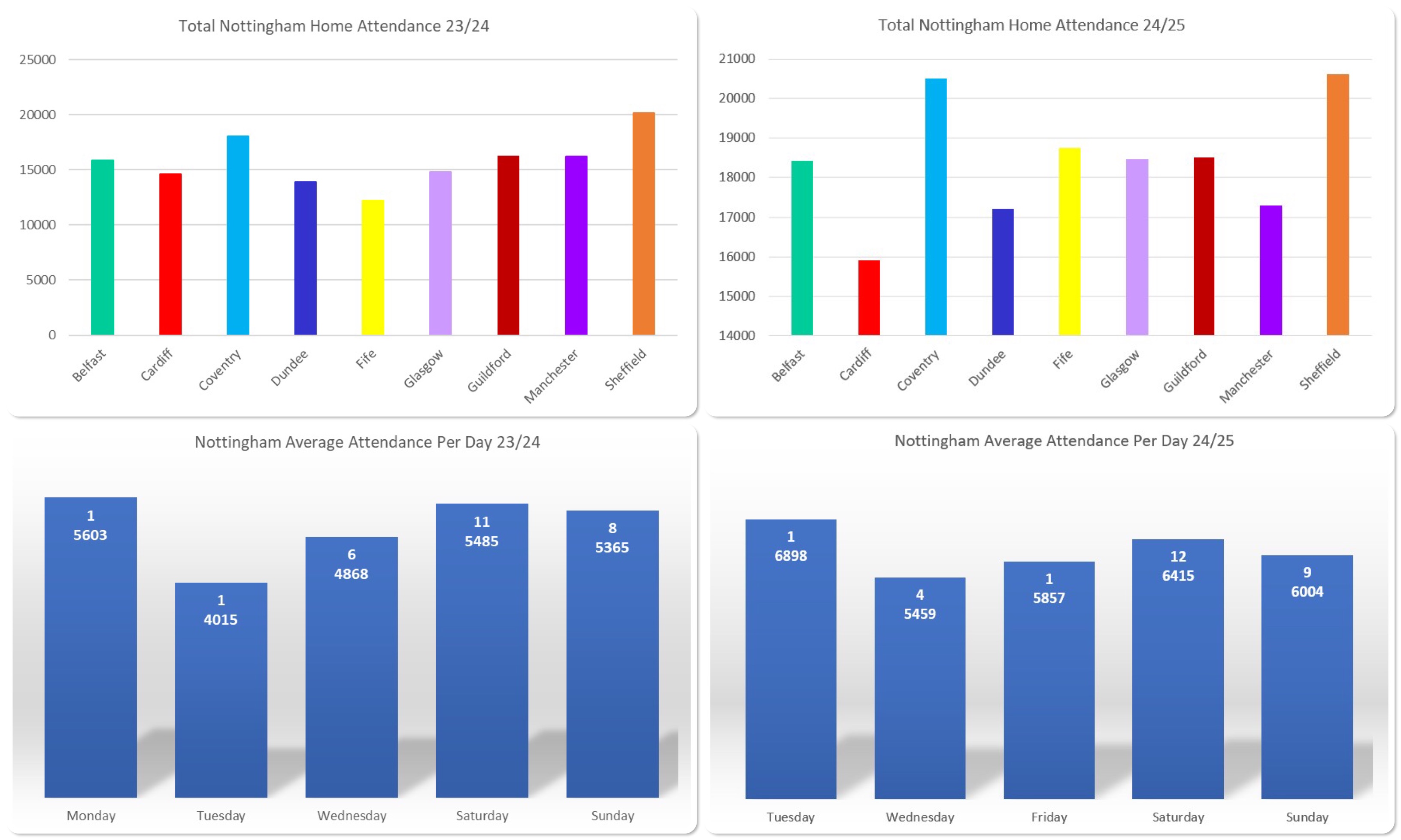 There’s been a drop in the numbers for the rivalry games from last season, they are still a stand out but both saw slightly less in attendance, however, most attendances against other opposition seem to have picked up the slack which is what seems to have continued their upward curve, but again, it’s only a slight upward curve.